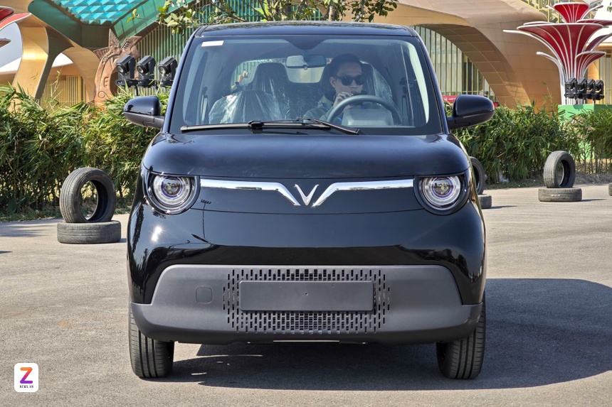 Phần đầu xe Minio Green sở hữu thiết kế tối giản. Logo VinFast cùng biểu tượng cánh chim mạ crom là điểm nhấn, bên cạnh cụm đèn chiếu sáng tạo hình tròn.