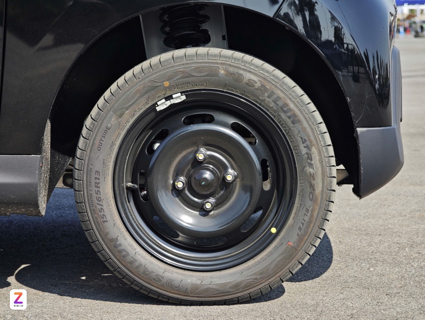 VinFast Minio Green trang bị mâm thép đường kính 13 inch. Bộ lốp thương hiệu Sailun đi kèm xe có thông số 155/65 R13. Phía trước dùng phanh đĩa, phanh sau dạng tang trống.