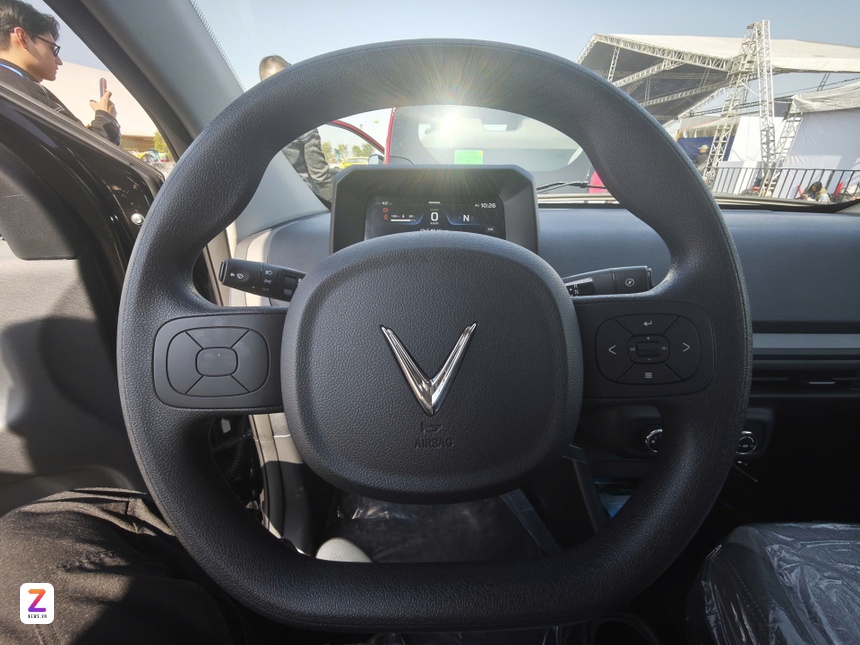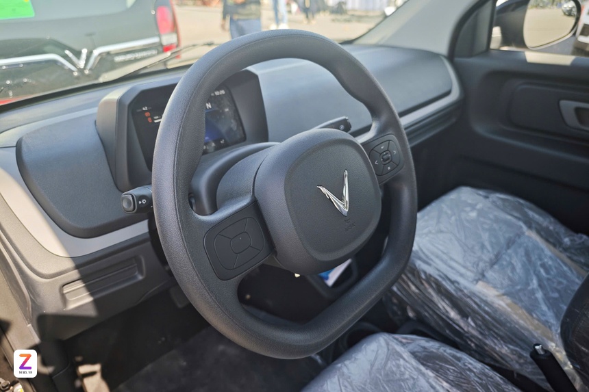 Vô lăng đáy phẳng 2 chấu trên Minio Green vẫn còn nhiều phím chờ. Loạt phím vật lý có sẵn dùng để điều chỉnh hệ thống âm thanh của xe. Cần số điện tử dạng thanh đặt sau vô lăng - thiết kế này tương tự VinFast VF 3.